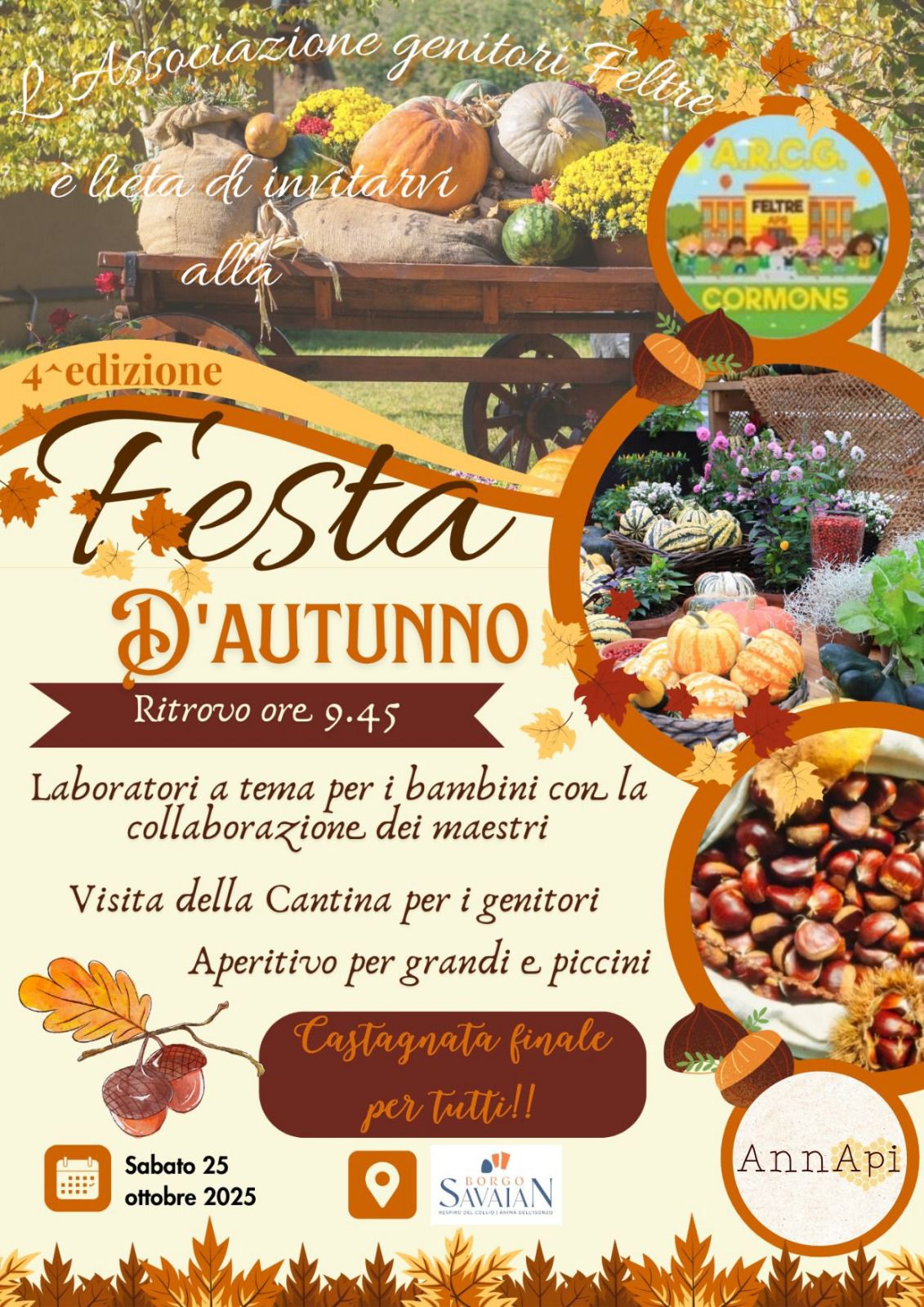 L'Associazione Ricreativa e Culturale Genitori Feltre APS è lieta di invitarVi alla 4a edizione della Festa d'Autunno, che si terrà sabato 24 ottobre 2025 con inizio alle ore 9:45.